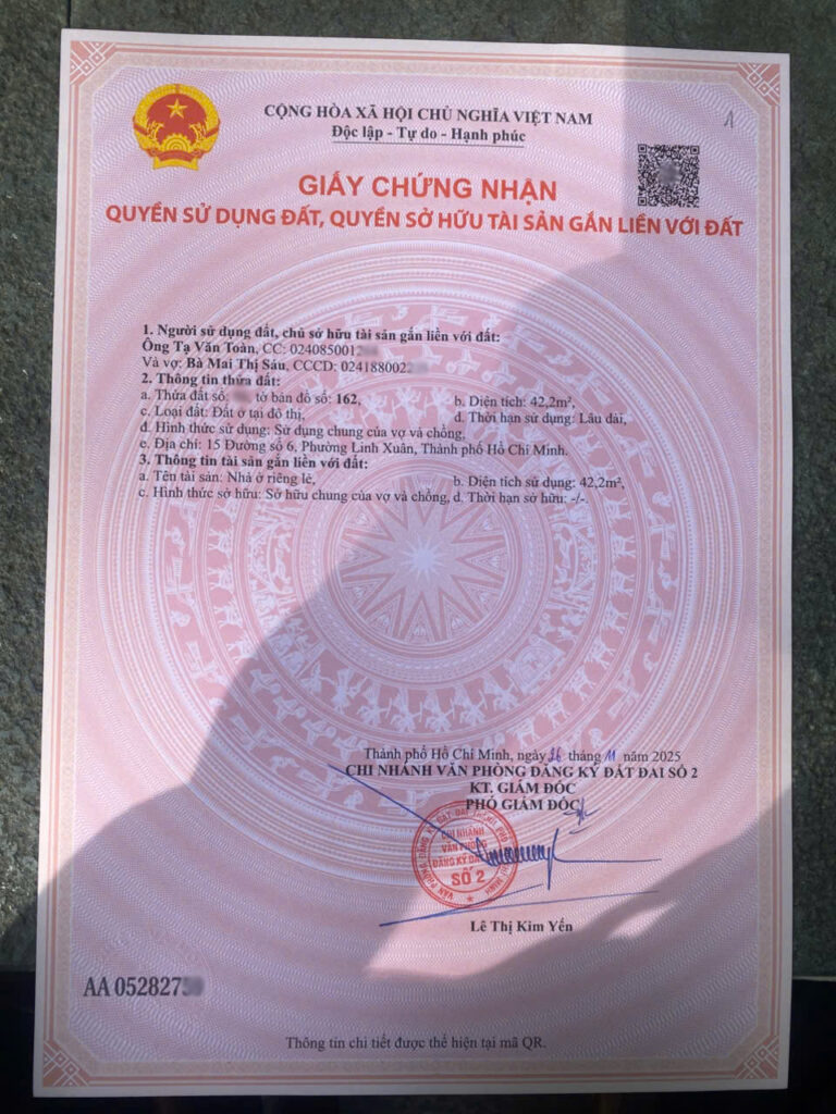 Hôm nay, Yeshouse Thủ Đức đã hoàn thiện và bàn giao bộ hồ sơ cấp đổi sổ hồng cho khách hàng cư trú tại phường Linh Xuân, quận Thủ Đức (nay là phường Linh Xuân, TP.HCM). Hồ sơ được tiếp nhận và xử lý trực tiếp tại Chi nhánh Văn phòng Đăng ký Đất đai Số 2.